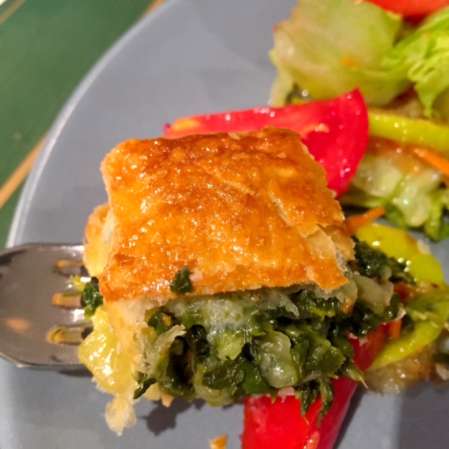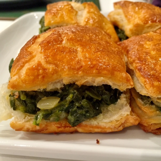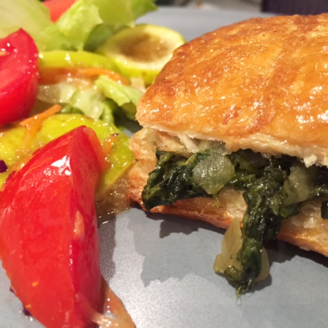 - Cuando el hojaldre esté listo se saca del horno y una vez frío se parte por la mitad y se rellena con el sofrito de espinacas.