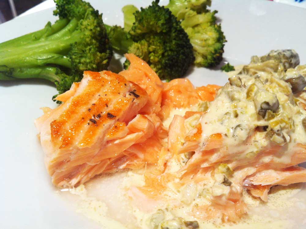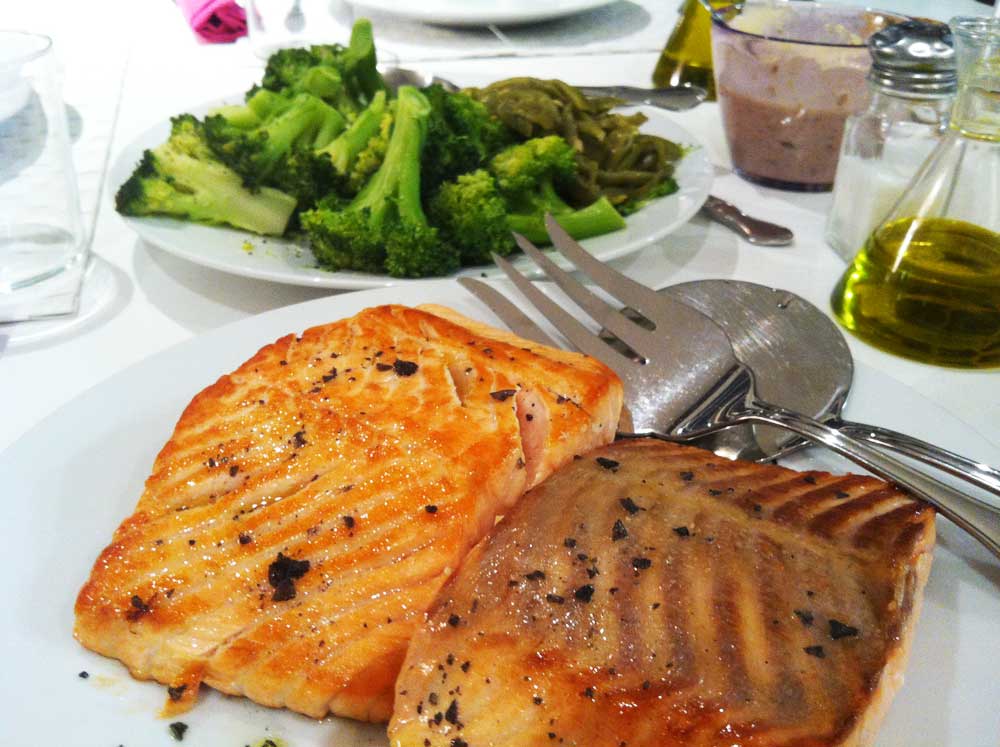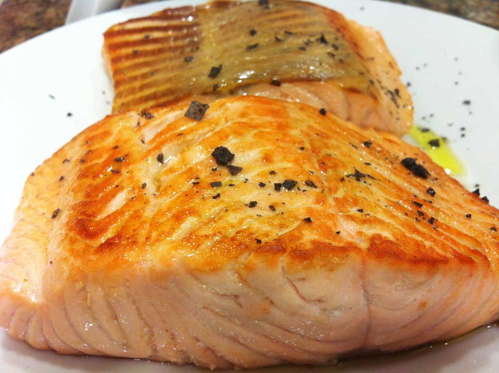 - Se calienta una sartén de fondo grueso a fuego fuerte con un par de cucharadas de aceite y se van friendo los filetes de salmón previamente salpimentados. Yo hago el pescado poco y el salmón en concreto muy poco pues es así como me gusta. Si lo hacéis del mismo modo os recomiendo congelarlo previamente 48 horas.