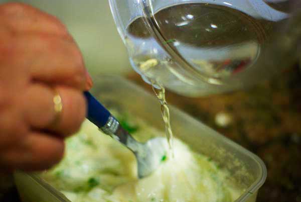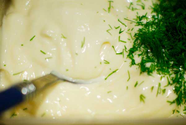 - Añadir la mostaza y el eneldo finamente picado