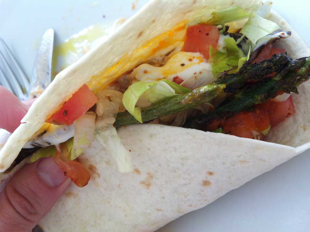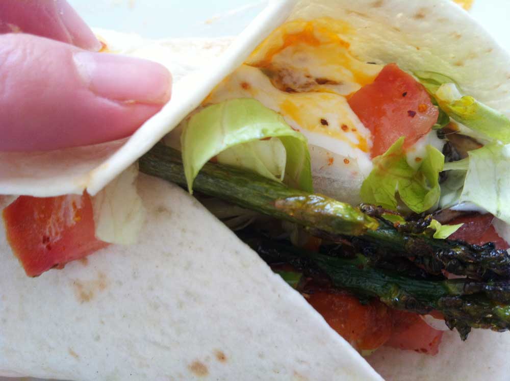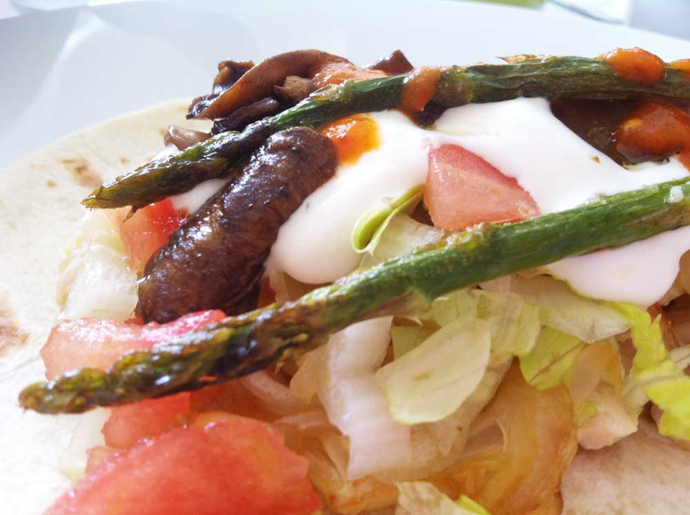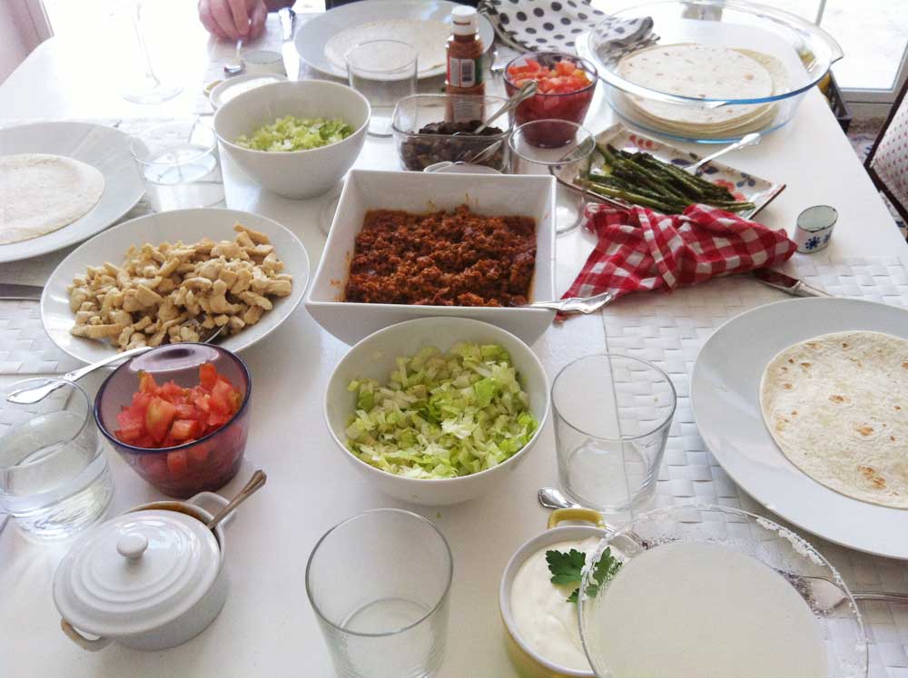 - Ahora cada comensal deberá coger una tortilla, disponer carne o pollo y el resto de la guarnición que desee, terminando con la salsa de queso blanco. Enrollar y disfrutar.